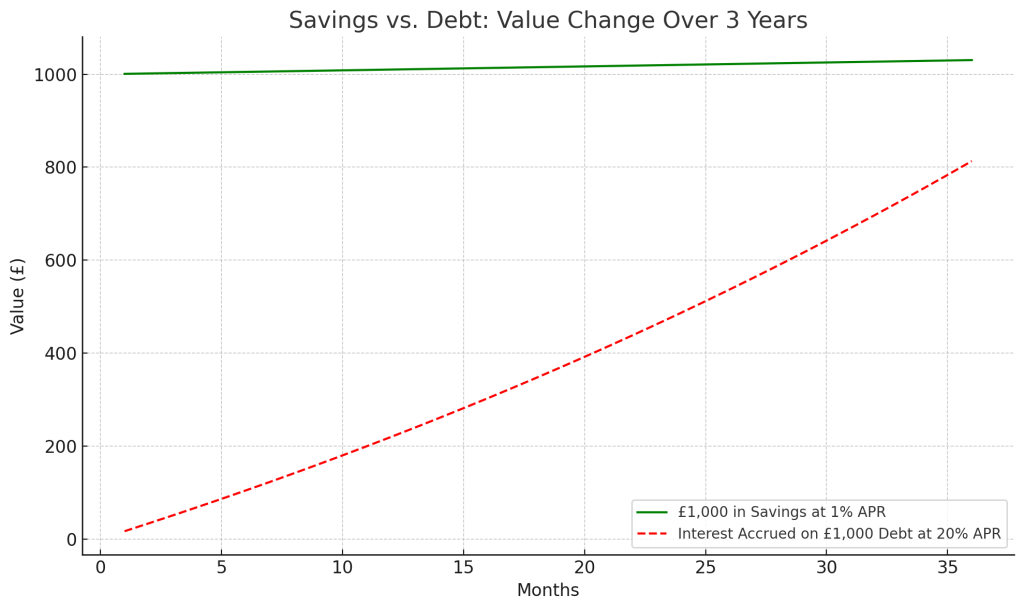 This clearly shows how interest compounds against you when in debt, and why clearing high-interest balances often outweighs low-yield savings — unless you’re building a basic emergency fund.